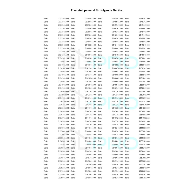 Suitable for the following brands/manufacturers: Beko Altus Ansonic Arcelik Arctic Atlas Belling Blomberg Bomann BRU Carrefour Continental Edison Cylinda ElektraBregenz Eskimo Essentielb Euromaid Far Flavel Friac Fricon Grundig Hyundai IFB Kenwood Lamona Listo Montpellier Orion Philco Princess Saba Saivod SchaubLorenz Smeg Wasco White-Westinghouse