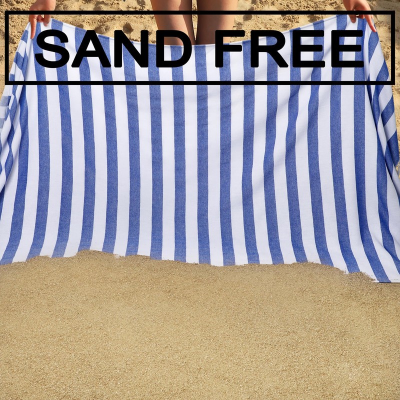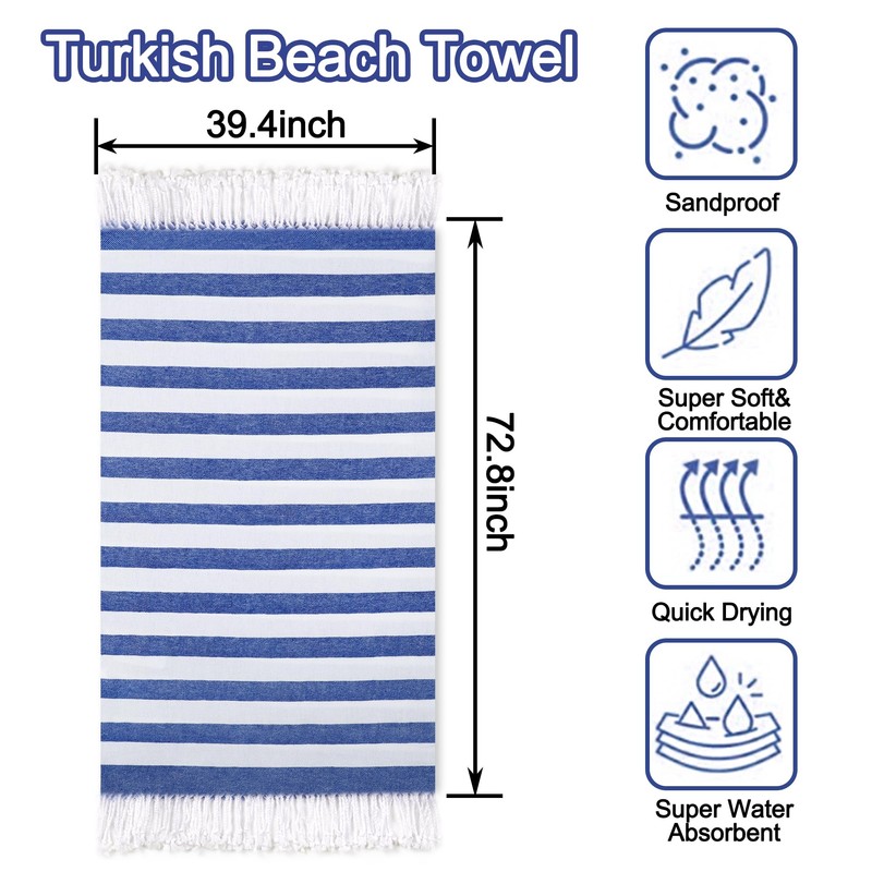 - 【SUPER SOFT&SAND FREE】 Our blue and white towels beach cool your skin with silky smoothness while providing extra care and protection from the elements that has natural aloe vera extract embedded in its fabric and is released every time you use it. So quick dry beach towel is super soft for touching with sleek fibers woven from turkish cotton.The sand free beach towel can be directly covered on the sand or grass, when not in use you can quick shake off the sand because of smoother surface