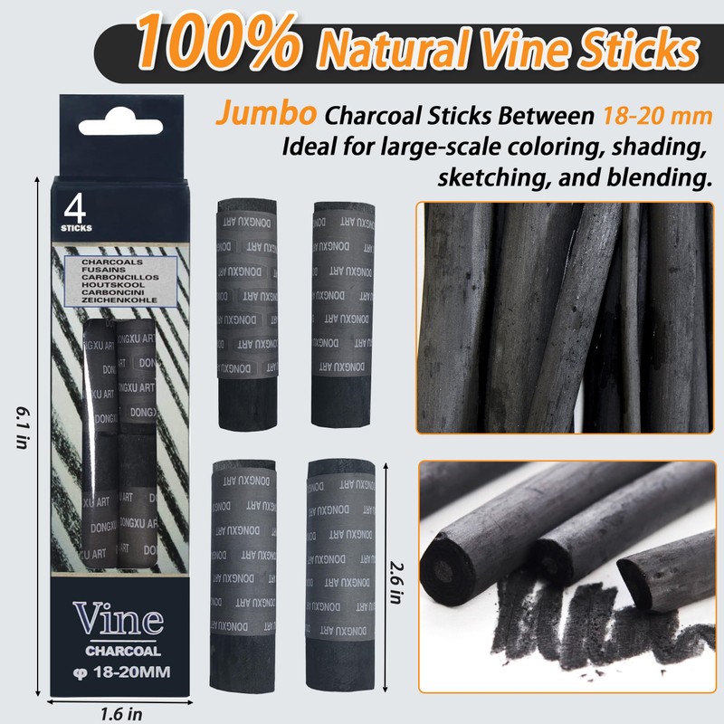 - Jumbo Vine Charcoal Sticks: Vine charcoal sicks kit contains 4 thick charcoal sticks between 18-20 mm. Each charcoal stick is around 2.6 inches (65 mm) long. Vine charcoal sticks are premium art tools widely used for drawing and sketching