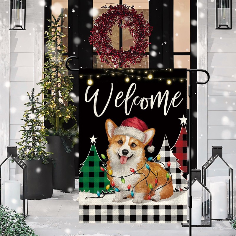 DLZDN Christmas Corgi Dog Tree Garden Flag 12×18 Inch Double Side Vertical Burlap Farmhouse Yard Sign Winter Holiday Outdoor Decoration
