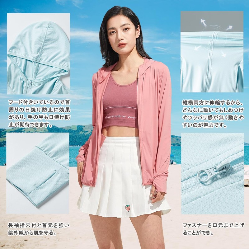 Long sleeves with finger holes and neck area protect your skin from strong UV rays. The zipper can be lifted up to the mouth, and it has a hood to prevent sunburns around the neck, and the back of the hand can also be expected to prevent sunburn.