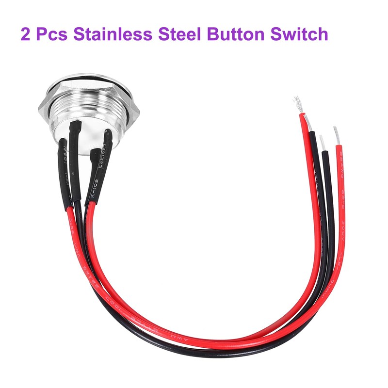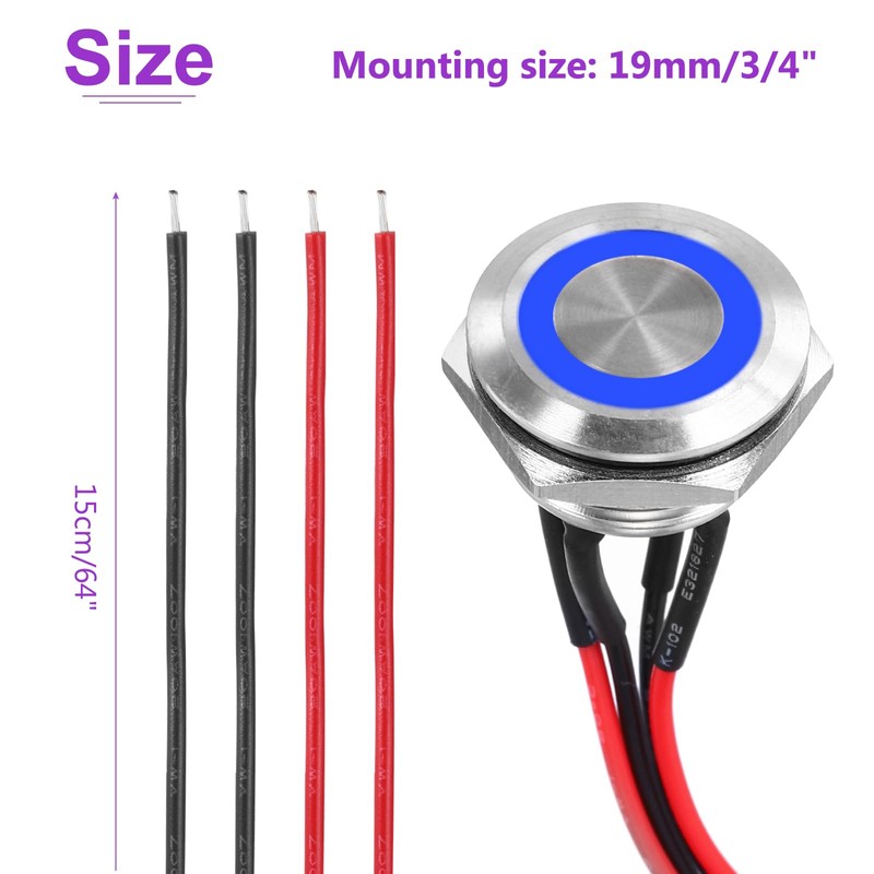 - Product Name: Push Button Switch; Material:Stainless Steel; Mounting size: 19mm/3/4 Inch; Pin number: 4; Pre-soldered Wire Size: 15cm/6 Inch; Action Type: Momentary; Rated Current: 3A; Rated Voltage: 12-24V; Contact Type: 1NO; Button Shape: Flat Head; Button Color: Silver; Light Color:White; IP Grade: IP65; Package Content: 2 x Push Button switch, 2 x Plug-in Terminals