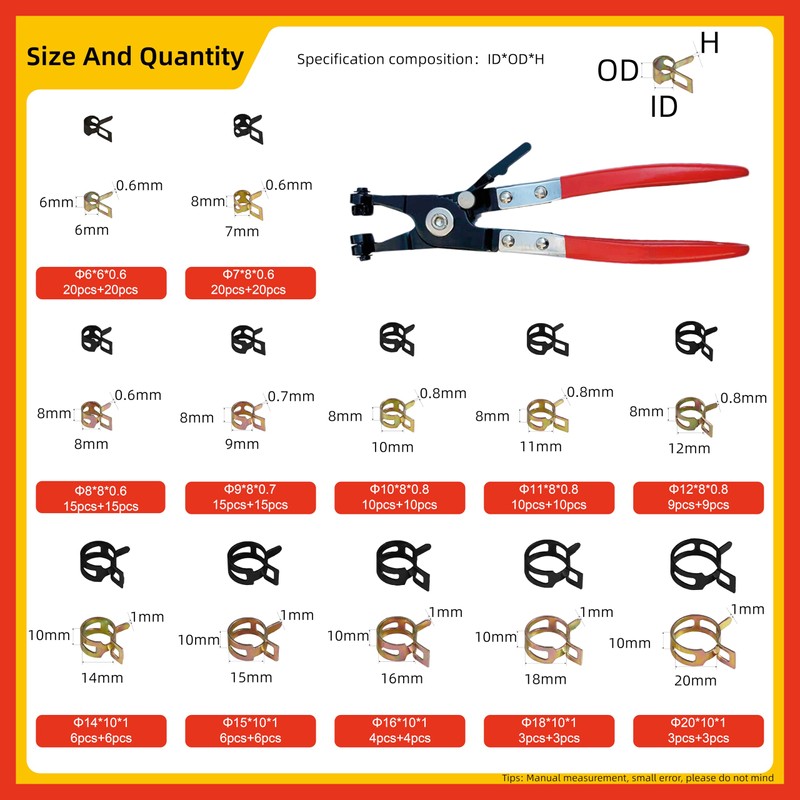 - UNIVERSAL SIZE. This 242-piece set includes 12 different sizes of spring clamps to meet various needs. Sizes: 6mm, 7mm, 8mm, 9mm, 10mm, 11mm, 12mm, 14mm, 15mm, 16mm, 18mm, and 20mm. Each size is precision-engineered to ensure a perfect fit for fuel lines, hoses, and tubing in automotive, motorcycle, marine, and DIY projects.