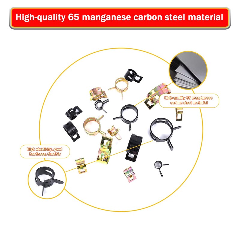 - EXCELLENT QUALITY. The fuel line spring clamps are crafted from durable steel with yellow and black zinc-plated finishes, offering excellent resistance to corrosion, rust, and high-pressure environments. These clamps are designed for secure and long-lasting performance in demanding applications.