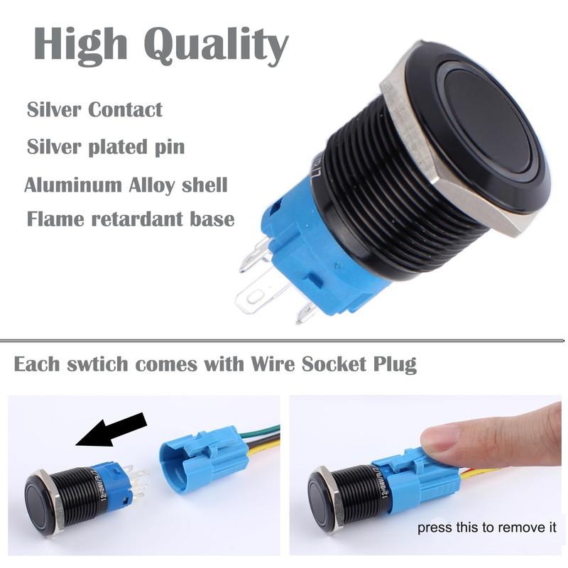 • Latching: Press the button-ON, Press the button again-OFF; Electrical life: 100, 000 times, Mechanical life: 500,000 cycles
