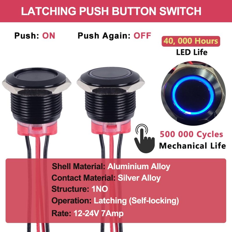 • Latching: Press the button-ON, Press the button again-OFF; Electrical life: 100, 000 times, Mechanical life: 500,000 cycles