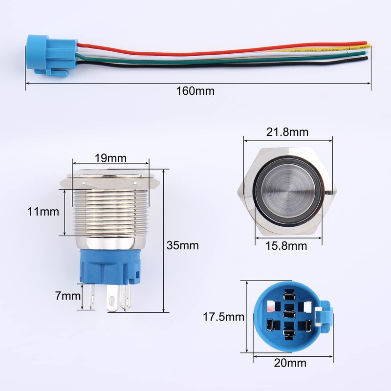 • Mounting Hole: 19mm(3/4"); LED Light: 3A 12V-24V Halo Ring Green; LED Life: 40, 000 hours