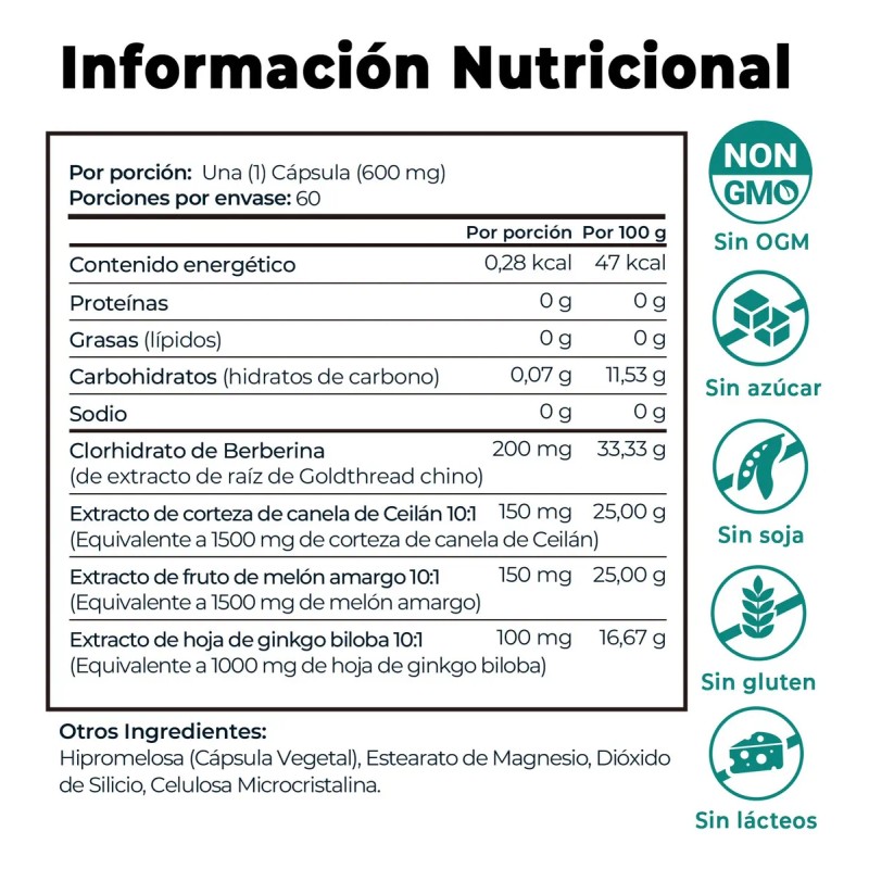 Refuerzo Natural del Sistema Inmunológico: Berberina con Canela de Ceilán y Fruto de Melón Amargo, conocidos por sus propiedades que refuerzan el sistema inmunológico y apoyan la salud digestiva y del tracto gastrointestinal.*