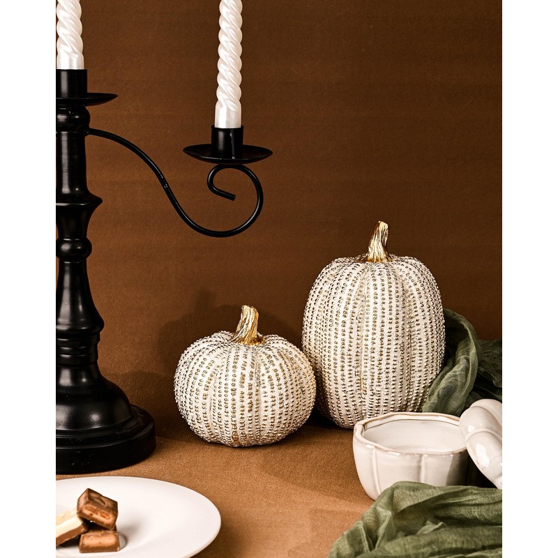 DN DECONATION 2 PCS Thanksgiving Resin Pumpkin Figurine, Fake Pumpkin Statues for Decorating, White and Gold Glitter Pumpkins for Table Centerpiece for Farmhouse, Fall, Gift