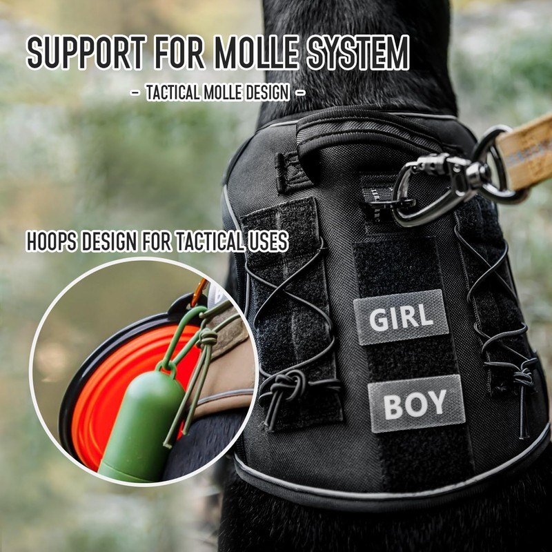 - MOLLE System Versatility: Equipped with Molle System on three sides and elastic strings, our harness offers customization. "BOY" or "GIRL" badges and Velcro ID tags allow personalization. The spacious Velcro plate lets you add your favorite badges, making it perfect for service, hunting, and outdoor adventures. You can even attach accessories like bowls, water bottles, and toys (accessories not included).