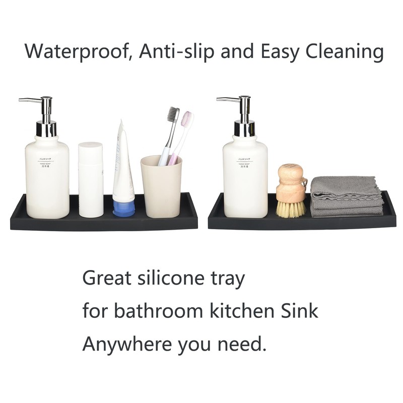 - Waterproof, Anti-slip and Easy Cleaning C This silicone tray is waterproof, anti-slip. It's excellent as a soap tray for kitchen sink areas or as a bathroom counter tray. Besides, this tray is easy to clean, which can be washed in the dishwasher.