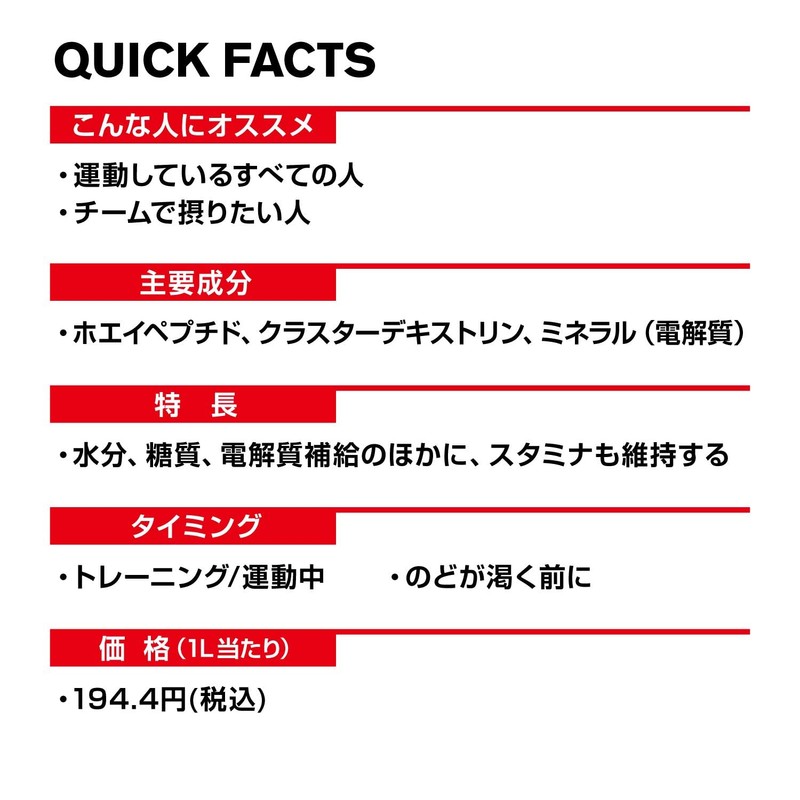 - 【原材料】デキストリン(クラスターデキストリン)、果糖、ホエイペプチド(乳成分を含む)、食塩/クエン酸、着色料(紅麹、クチナシ)、乳化剤(大豆由来)、香料(ゼラチン由来)、甘味料(スクラロース、アセスルファムK)、塩化K、クエン酸Na、炭酸Mg