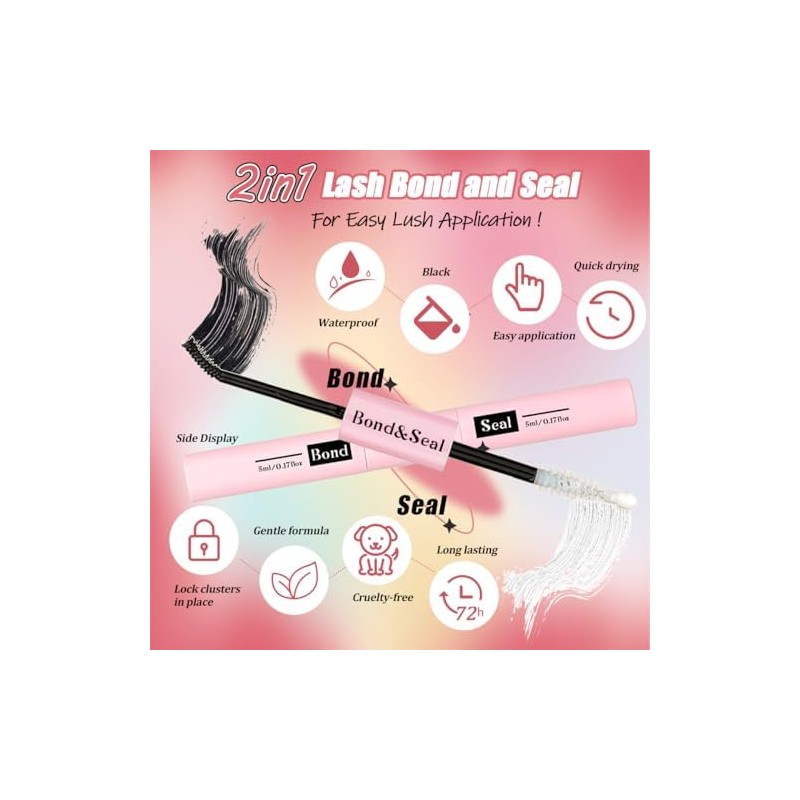 - Lash Bond Seal and Remove:This 2in1 bond and seal design is both convenient and efficient.The eyelash adhesive provides long lasting adhesion,and the eyelash seal increases firmness.Its waterproof and sweat resistant performance ensures at least 72 hours.Our eyelash removal wand can easily remove excess adhesion and sealing from eyelashes,just wait for about 30s,and removing eyelashes is very convenient.The capacity for different functions is (5ml) 0.17fl.oz,compact and easy to carry.
