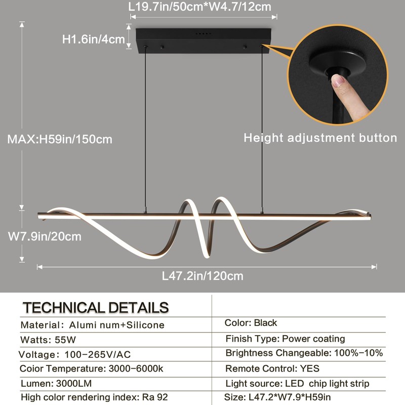 - 【Dimming linear island light】: Enhance the ambiance of your dining room with Dnshjue modern LED chandelier. Size: L47.2 x W7.9in, Canopy Dimensions:L19.7x W4.7x H1.6in,Height adjustable MAX: 59 inche ,this fixture comes with a remote control, allowing you to smoothly adjust the color temperature from warm white 3000K to cool white 6000K. You can also regulate the brightness from 10-100%, creating a contemporary and stylish atmosphere in your space.