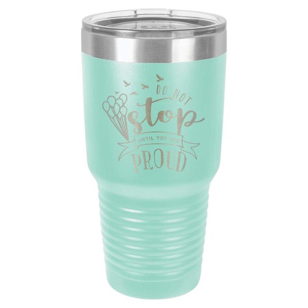 - PREMIUM QUALITY ENGRAVED TUMBLER: This 30 oz Do Not Stop Until You Are Proud Engraved Tumbler has a colored powder coating and our laser engraver removes this powder coating, exposing the high quality stainless steel and comes with a clear lid. THIS IS NOT A DECAL! Ideal for hot & cold beverages. A great gift for birthdays, Christmas, family occasions, vacations, beach, pool or travel.