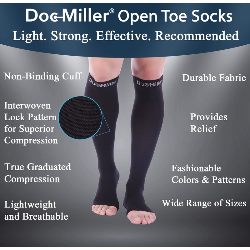 Doc Miller Calcetines de Compresión de Punta Abierta (1 par) 30-40 mmHg Medias de Compresión Para Ejercicio, Recuperación, Dolores, Varices, Mangas para Pantorrillas (Negro, Grande Alto)