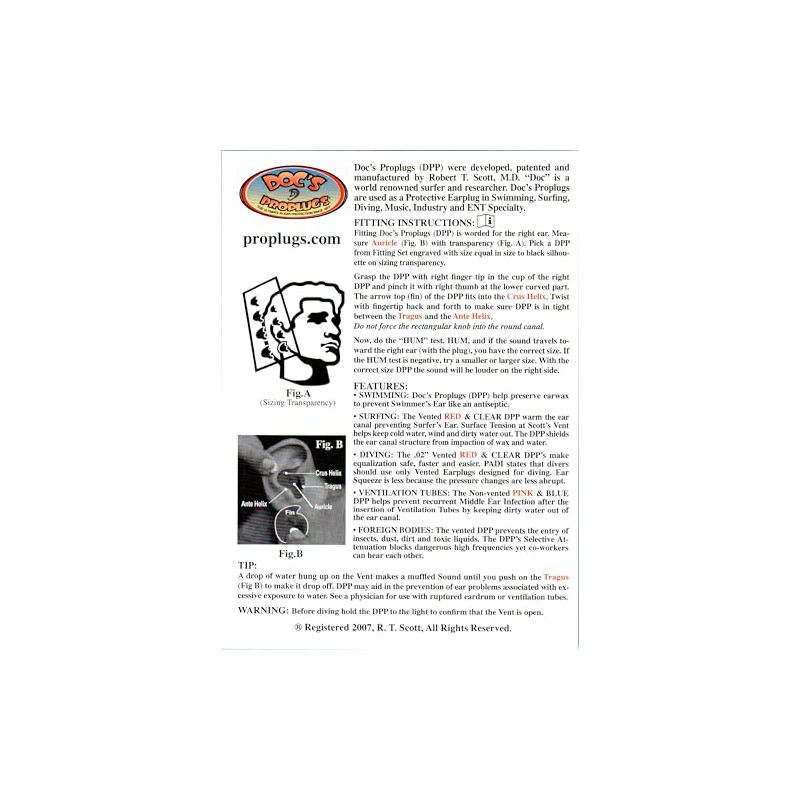 Doc's preformed earplugs are re-useable and made of soft, latex free plastic. Proplugs are available in eight pre-molded sizes and fit 95% of the population. Non-vented earplugs are used for medical applications to prevent water and high pitch sounds from entering the ear canal. Vented earplugs are perfect for water sports to prevent cold water and wind from irritating the ear canal, prevents surfer's ear, and helps diver's to equalize easier.