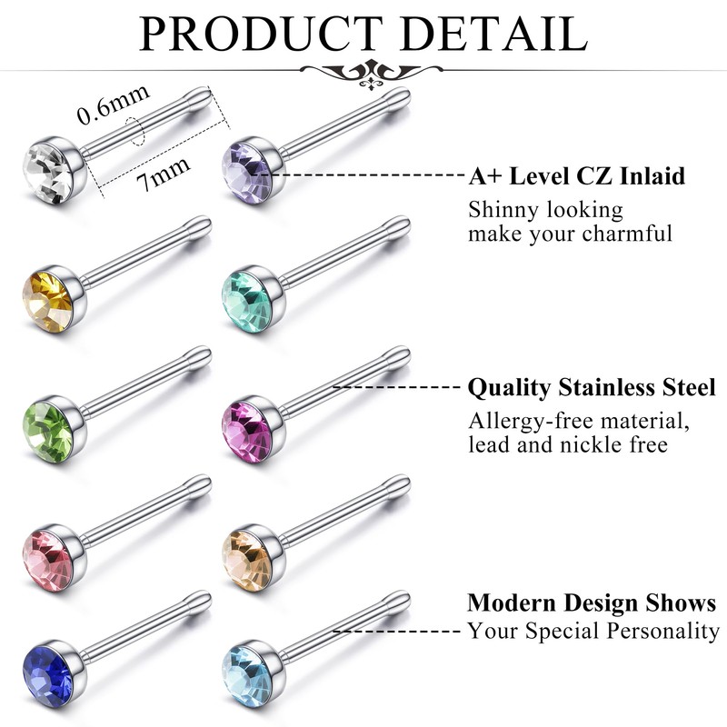 - 【SIZE】♡Nose rings, nose stud thickness: 22G (0.6mm), 20G (0.8mm) for you to option, nose ring inner diameter: 6mm, 8mm, 10mm. Nose stud bar length: 7 mm, CZ size: 1.5 mm, 2 mm, 2.5 mm.