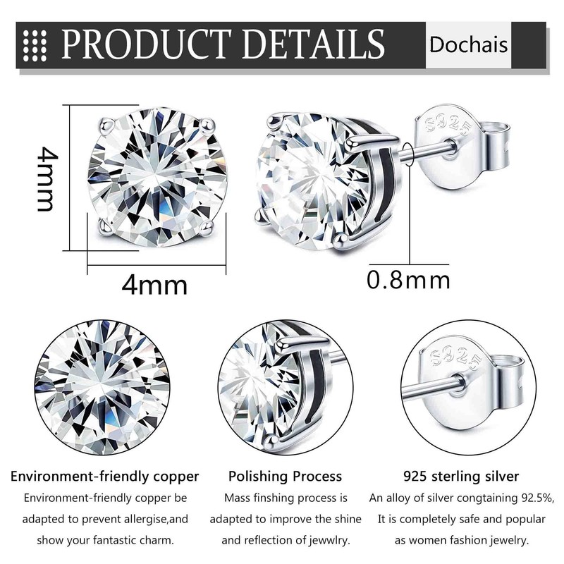 Dochais Zircon Stud Earrings 925 Sterling Silver for Women Men Earrings Small Round Crystal Sparkling Stud Earrings Hypoallergenic Jewellery 3 mm/4 mm/5 mm/8 mm, Silver