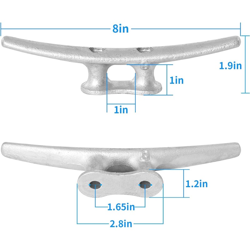- 【Cleat Size & Bolts】These galvanized boat cleats have a size of 8 inches in length and 1.9 inches in height, with a base measuring 2.8 inches x 1.2 inches. The mounting holes are spaced 1.65 inches center to center. The dock cleats 8 inch with hardware, including M8x4.1 inch (105mm) bolts and nuts. The cleats for boat dock are designed to be a perfect size to fit any use, and if needed, the bolts can be cut to the desired length