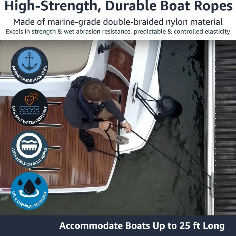 - The 3/8 inch 25 ft dock lines resistant to storms, saltwater, UV rays, acids, and oils. The tighter double-braided construction ensures Pacthsd boat ropes for docking withstand long hours of intense use
