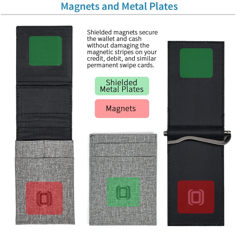 - Shielded magnets secure the wallet and cash without damaging the magnetic stripes on your credit, debit, and similar permanent swipe cards