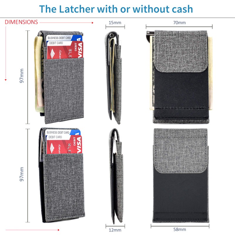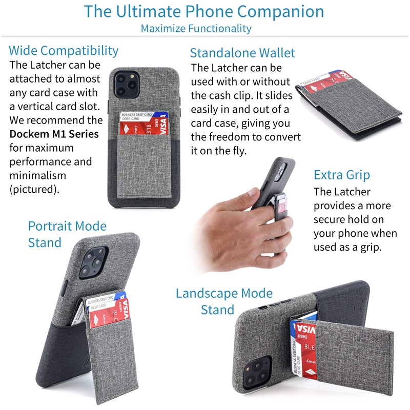 1. The Latcher can hold it's own as a minimalist standalone wallet that will hold 5 cards comfortably as well as 20+ bills. For additional functionality, the Latcher is also specifically designed to attach to your smartphone by sliding into a card slot on your smartphone case. Specifically designed to be compatible with any of Dockem's M-series card cases.