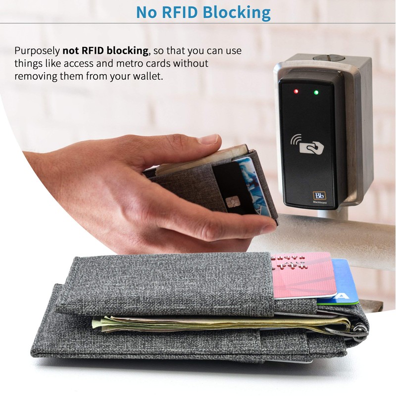 - Purposely not RFID blocking, so that you can use things like access and metro cards without removing them from your wallet. RFID blocking is over-rated in wallets - look it up!.