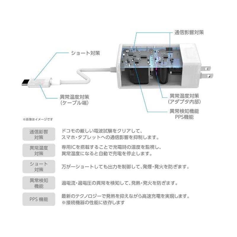 The next generation fast charger has a maximum of 45 W output and the latest charging technology "PPS" (ProgrammablePowerSupply), so you can charge it up to 1.5 times faster than conventional chargers.