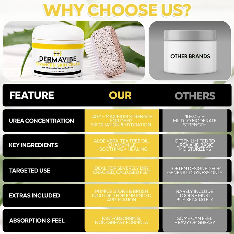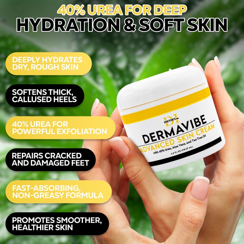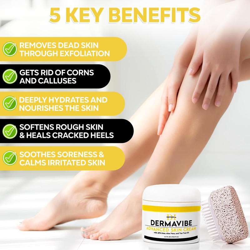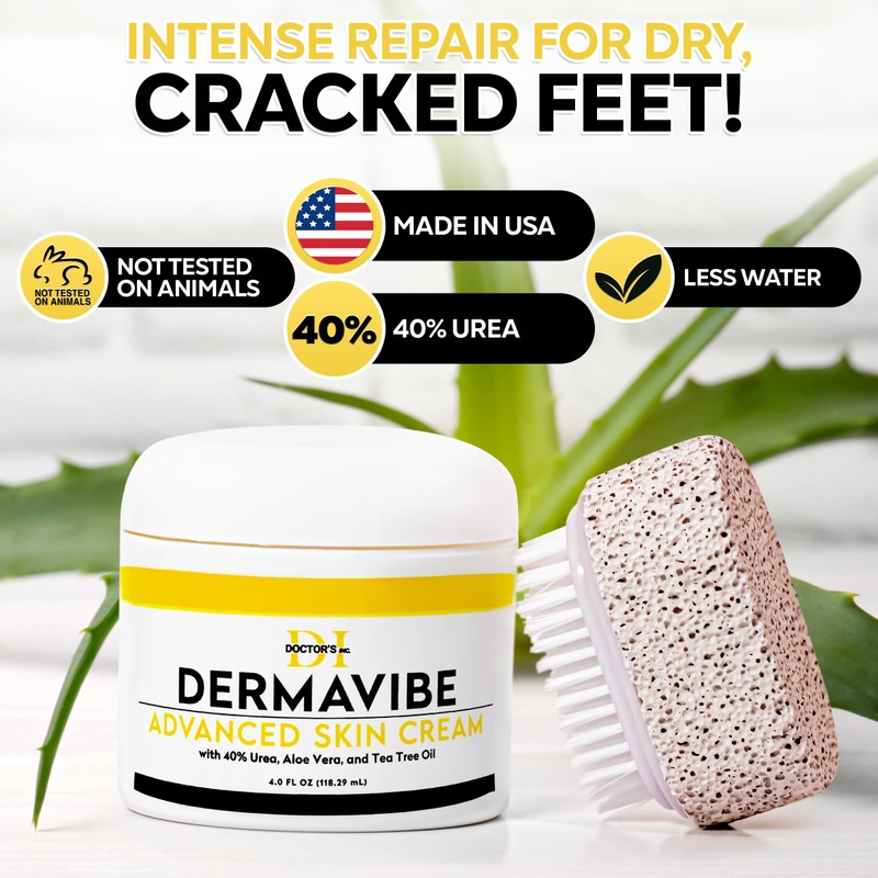 - EXFOLIATES & SOFTENS TOUGH, CALLUSED SKIN: Formulated with 40 percent urea, our powerful Dermavibe feet cream breaks down rough, built-up skin and deeply penetrates dry areas to restore desired smoothness. Ideal for cracked heels, calluses, and thickened soles, it gently exfoliates while providing essential hydration for softer, healthier feet.