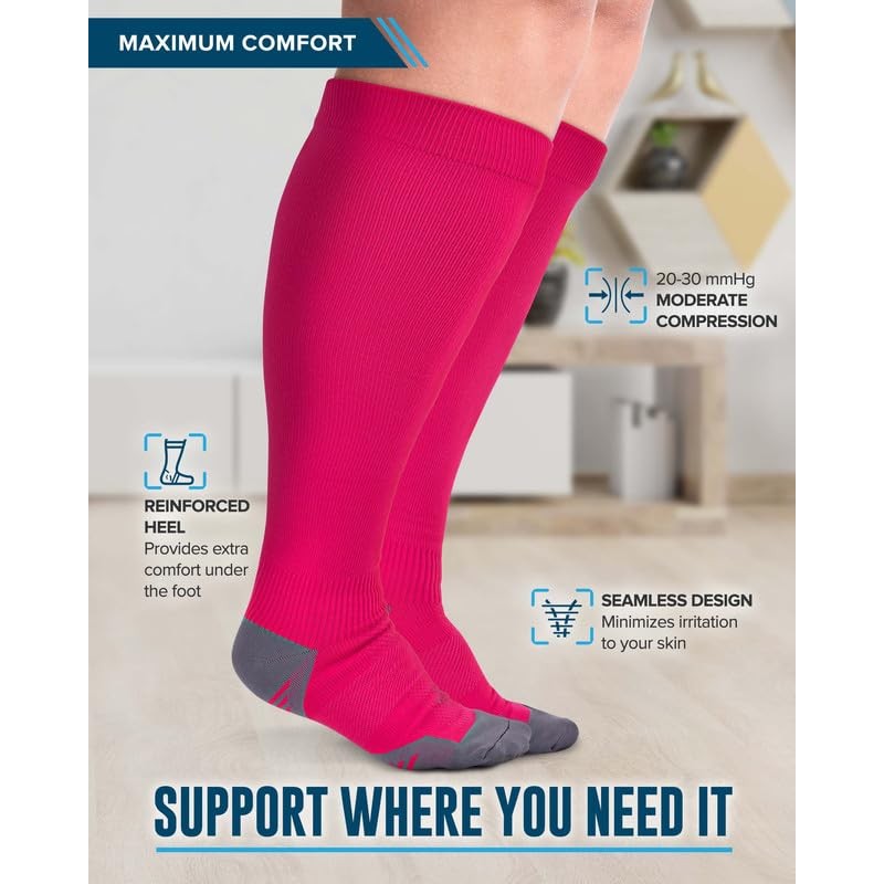 Doctor's Select 3 pares de calcetines de compresión de tamaño grande de pantorrilla ancha – hasta 6XL | 20-30 mmHg Calcetines de compresión para mujer de pantorrilla ancha, 1 par rosa, 1 par morado, 1