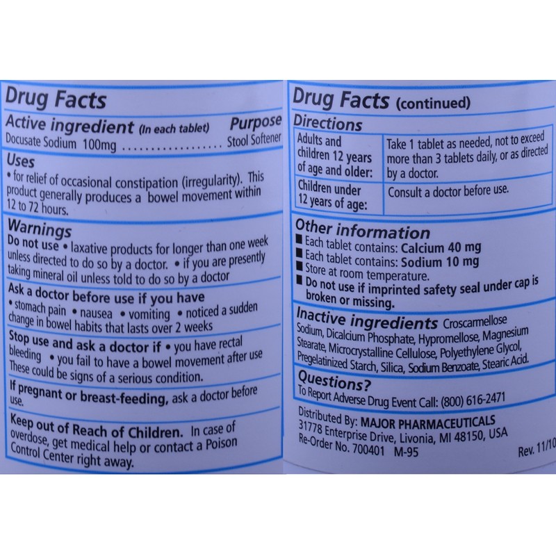 Count 100 Tablets per Bottle. Stool Softener Laxative provides safe, effective and fast relief for your occasional constipation. Stool Softener goes to work gently, usually producing bowel movements within 12-72 hours. This laxative formula uses 100 mg of Docusate Sodium stool softening laxative as the active ingredient. Compare this formula with name-brand laxatives and save big. Same relief at much lower prices.