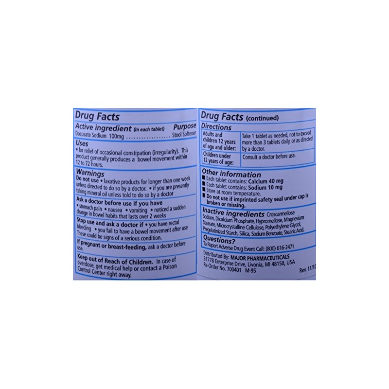 Count 100 Tablets per Bottle. Stool Softener Laxative provides safe, effective and fast relief for your occasional constipation. Stool Softener goes to work gently, usually producing bowel movements within 12-72 hours. This laxative formula uses 100 mg of Docusate Sodium stool softening laxative as the active ingredient. Compare this formula with name-brand laxatives and save big. Same relief at much lower prices.