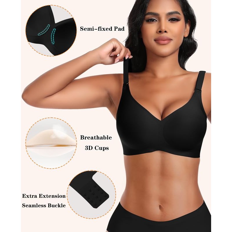 DOCUMO 2 Packs Wireless Bras for Women No Underwire Seamless Full Coverage Push Up Bras with Support and Lift, V Neck Bralette with Bra Extender(Black+Nude,Large)