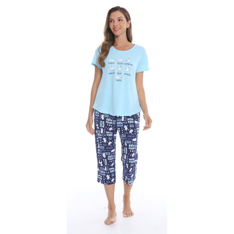 dodoin Women's Cotton Sleepwear Tops with Capri Pants Casual and Fun Prints Pajama Sets (Blue Cat, M)…