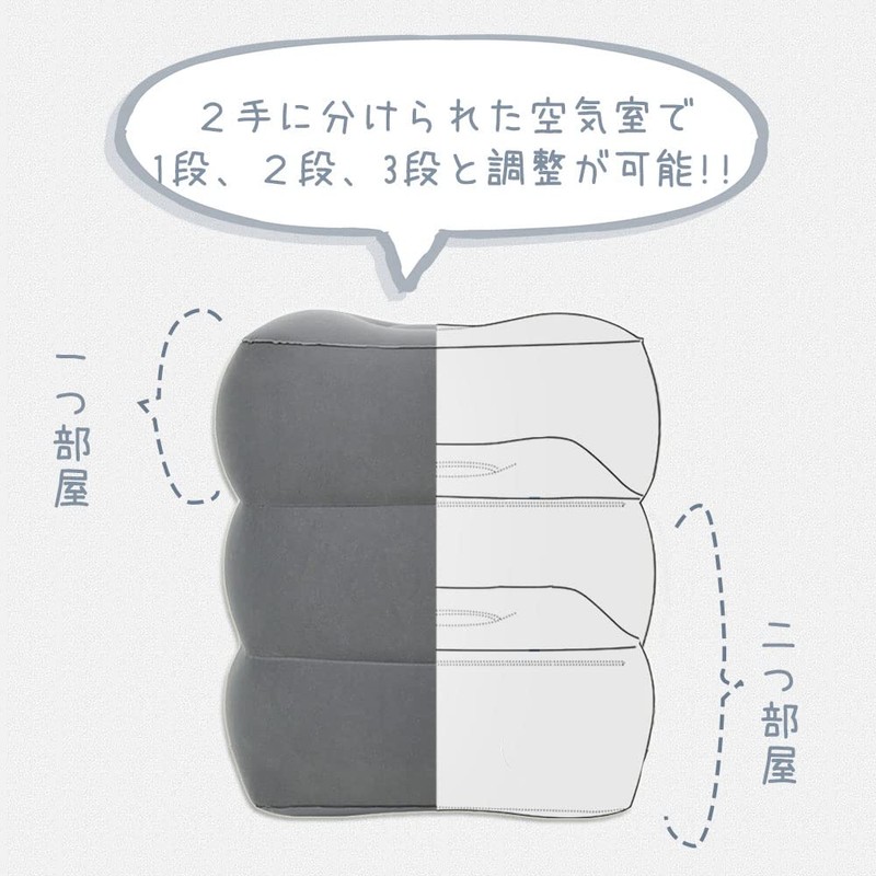 - 【3段階高さ】2気室に分かれており、使用する場所や、普段慣れている高さに合わせて、3段階の調節が自由にできます。自動車内では座席と同じくらいの高さの2段がおすすめ。新幹線、飛行機では3段の高さがおすすめです。