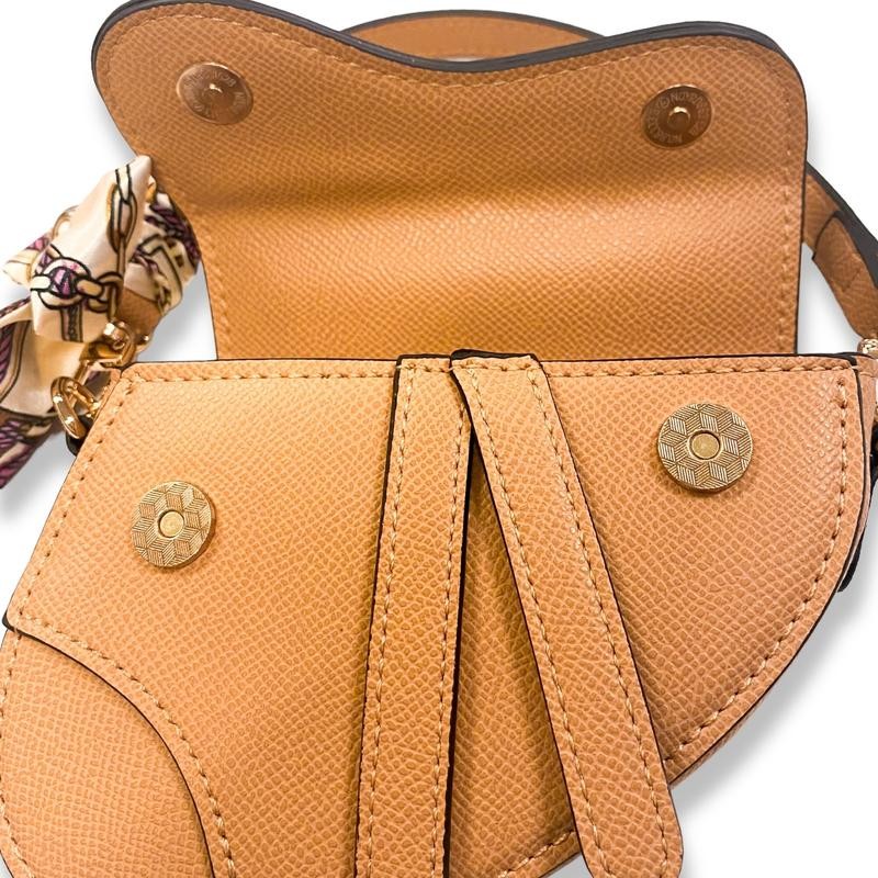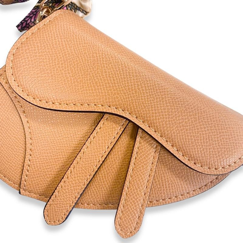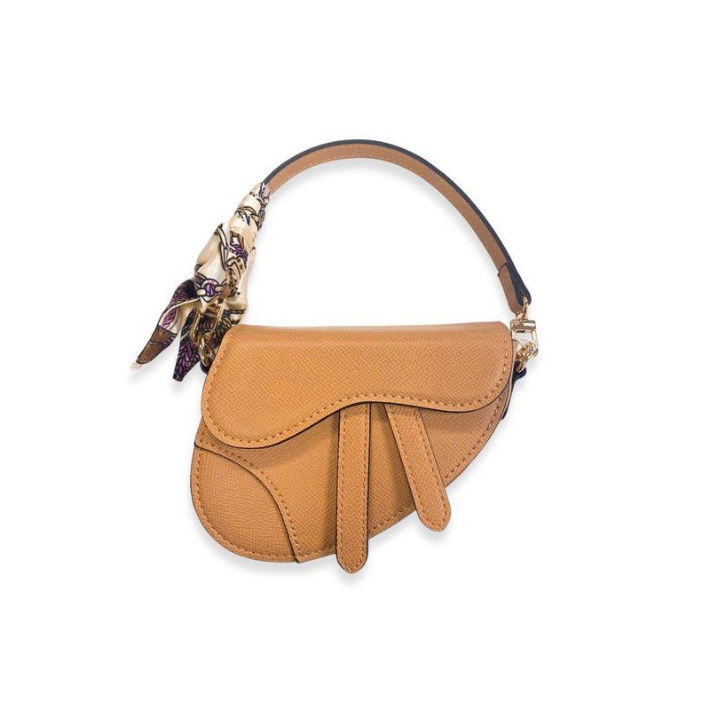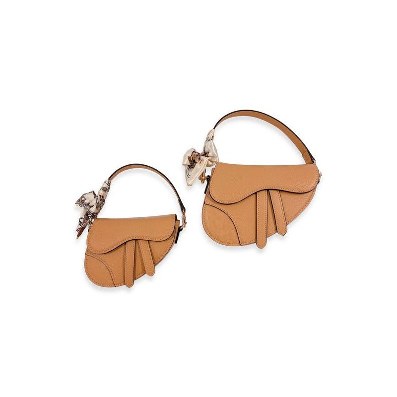 This classic saddle style is finished with a tied scarf and includes a detachable golden chain. The perfect purse for you to match with your mini me!