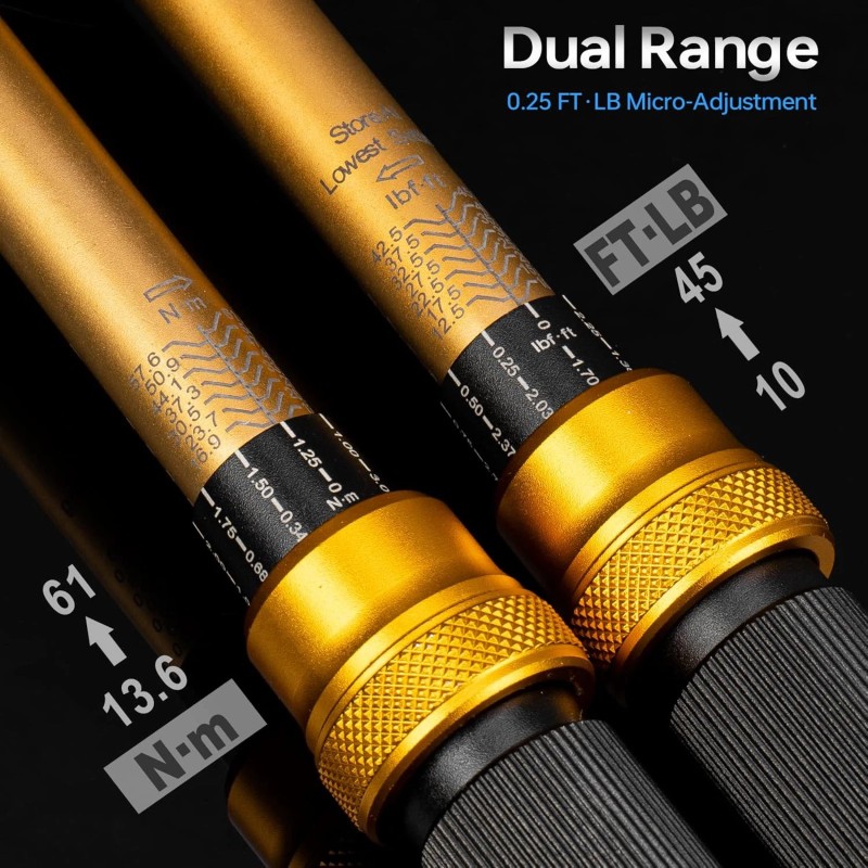 - ± 3% High Precision: Dual torque range of 10-45 ft-lbs/13.6-61 nm, with 0.25 ft.lb micro-adjustment. Pre-calibrated to ± 3%, and each wrench has a traceable calibration certificate. Simply hear the "Click" sound when you've reached the pre-set torque value. This signals you to stop applying force to prevent overtorque damage to your items.