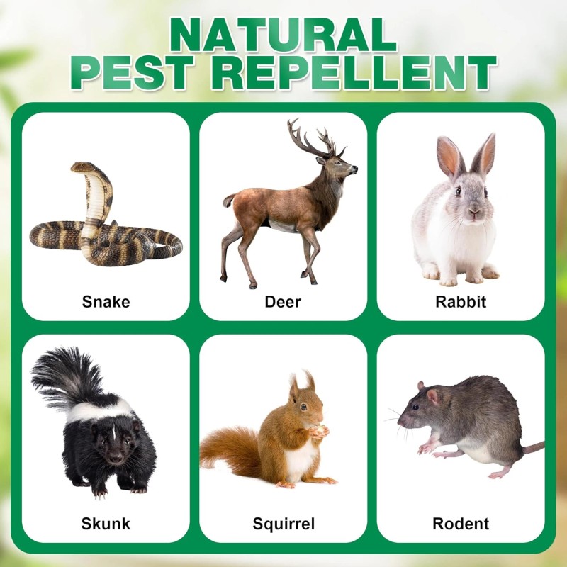 - LONG LASTING PROTECTION: Our raccoons repellent for garden can last for up to 30-60 days, protect 120 sq ft and repel all kinds of animals e.g. skunks, raccoons, fox, deer, rabbit, mouse, rat, snakes, mole, gopher, groundhog, vole, bamboo rats, crested rats and other rodents