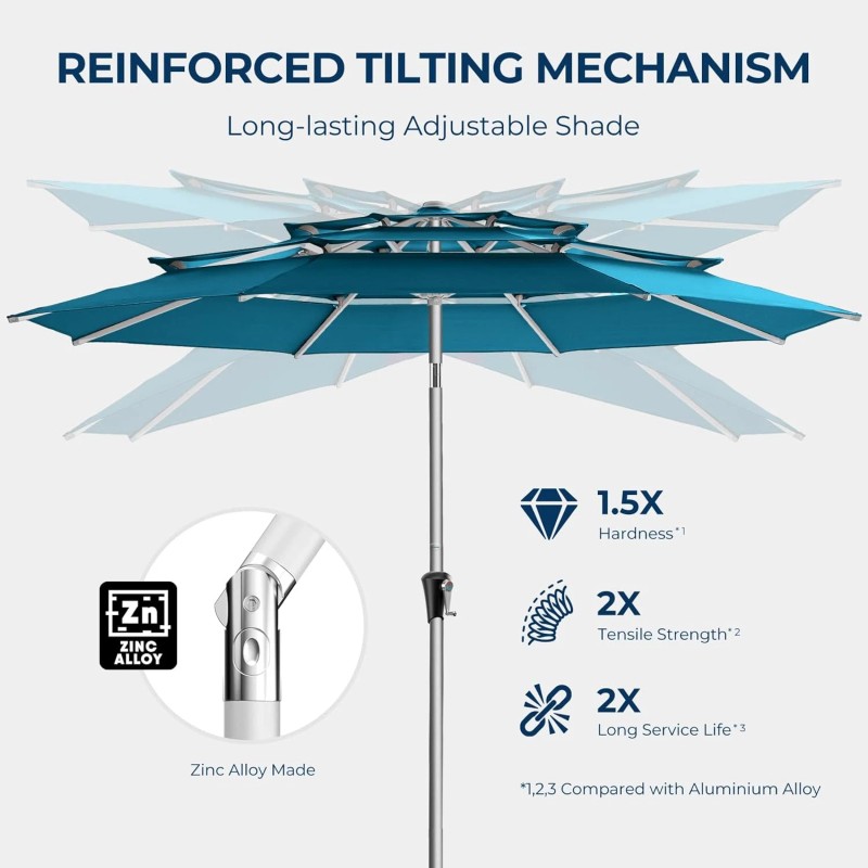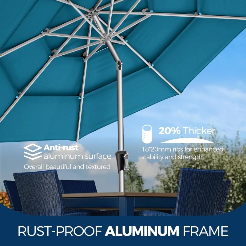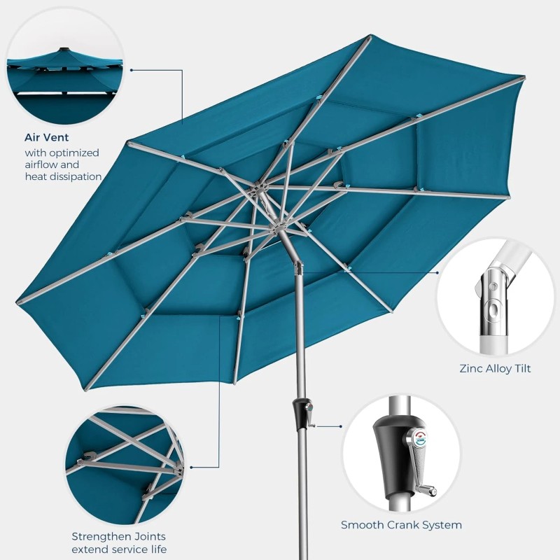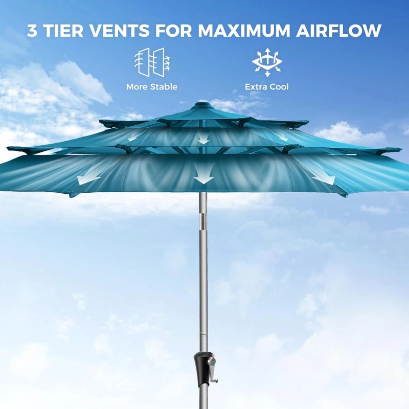 - HIGH-QUALITY MADE: 3-tier full-aluminum vented outdoor patio umbrella with anodized surface technology and 260GSM solution-dyed polyester with performance similar to sunbrella fabric. Beautiful and high-end, fashionable and durable, windproof and rustproof. Perfect for high-end commercial markets, humid swimming pools, windy and hot locations.