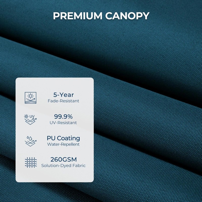 - PREMIUM CANOPY: Made of high-quality 260gsm solution-dyed fabric with UPF50+ anti-UV coating provides 5-year fade-resistant, 99.9% UV-resistant, and water-repellant properties. Effectively blocks harmful UV rays including UVA and UVB to protect your health.