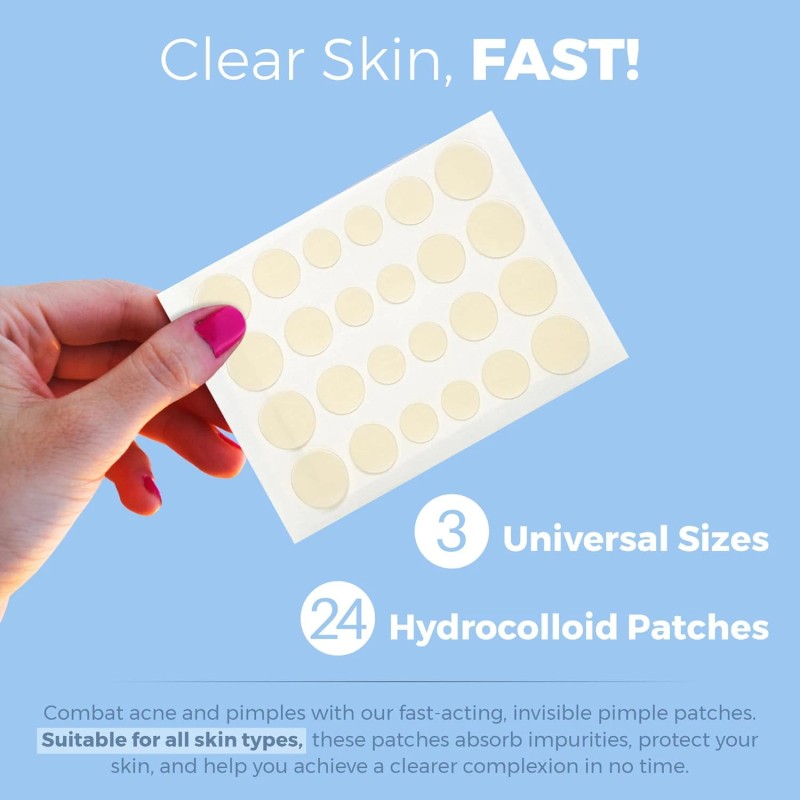 - Acne Patches for Face - Hydrocolloid Bandages (24 Count) Pimple Patches for Face in 3 Universal Sizes, Acne Spot Treatment Care for Face & Skin Spot Patch Conceals Zits, Acne and Blackheads