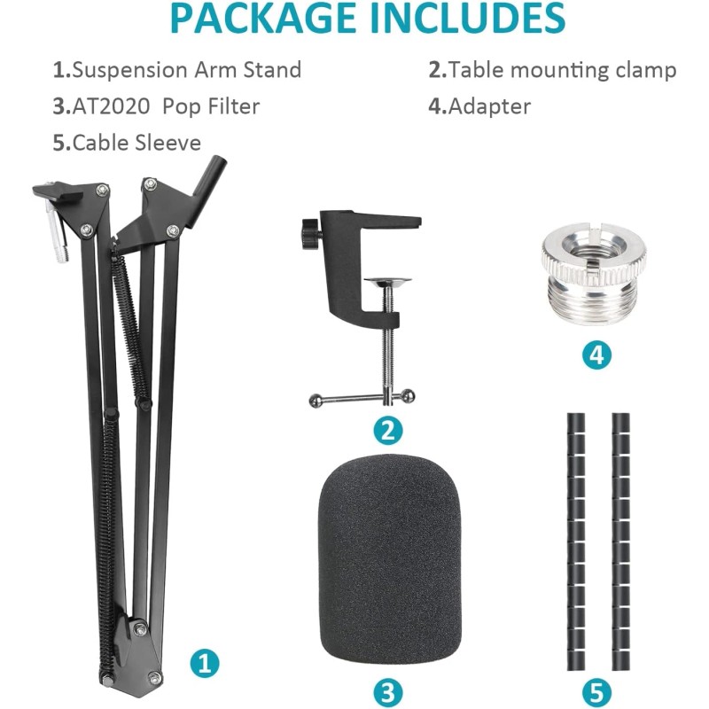 - Package included: 1 x Audio-Technica AT2020 Windscreen, 1 x AT2020 Mic Scissor Arm Stand, 2 x Cable Sleeve, 1 x Screw Adapter. Mic not included.