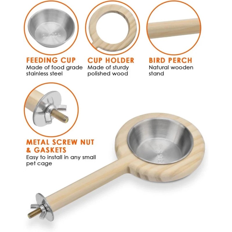 - FEEDING CUP & PERCH: KATUMO bird food bowl and wooded perch are combined in one, suitable for parakeet, canary, conure, lovebird, budgie and more small pets. Your bird will surely love to sit on the rim or the wood perch for rest after feeded