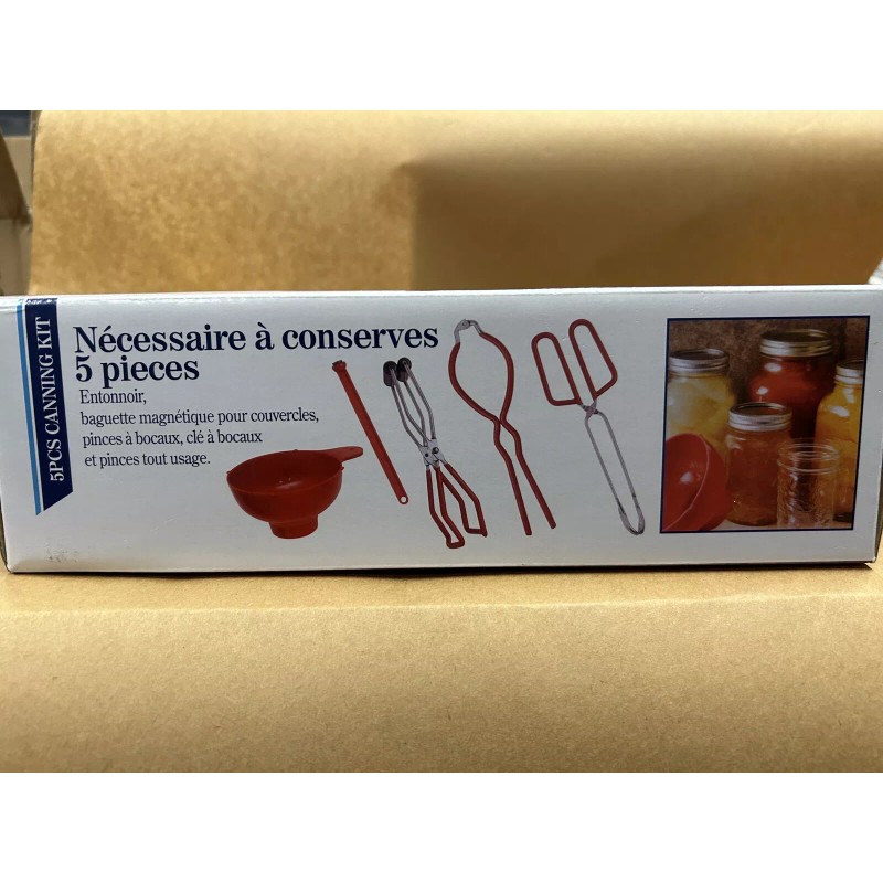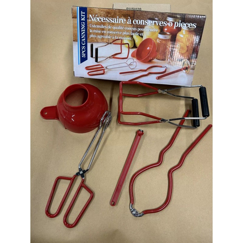 5 piece Canning Kit includes: funnel, magnetic lid lifter, jar lifter, jar wrench & tongs