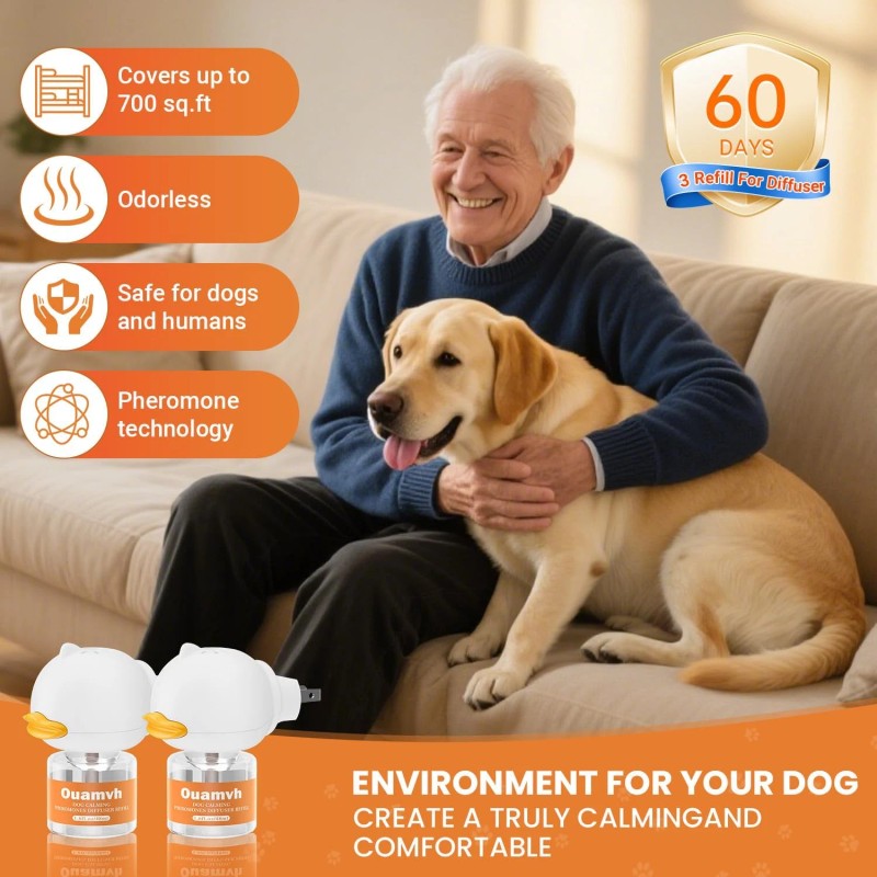 - Relieve stress and anxiety: Our pheromone diffuser can effectively relieve common stress and anxiety in dogs, including visits to the vet, fireworks, storms, environmental changes, separation anxiety, scratching and biting, urine spraying, and being alone at home. When your dog relaxes and shows more positive behaviors, the relationship between you will deepen, creating a harmonious and loving environment for both of you.