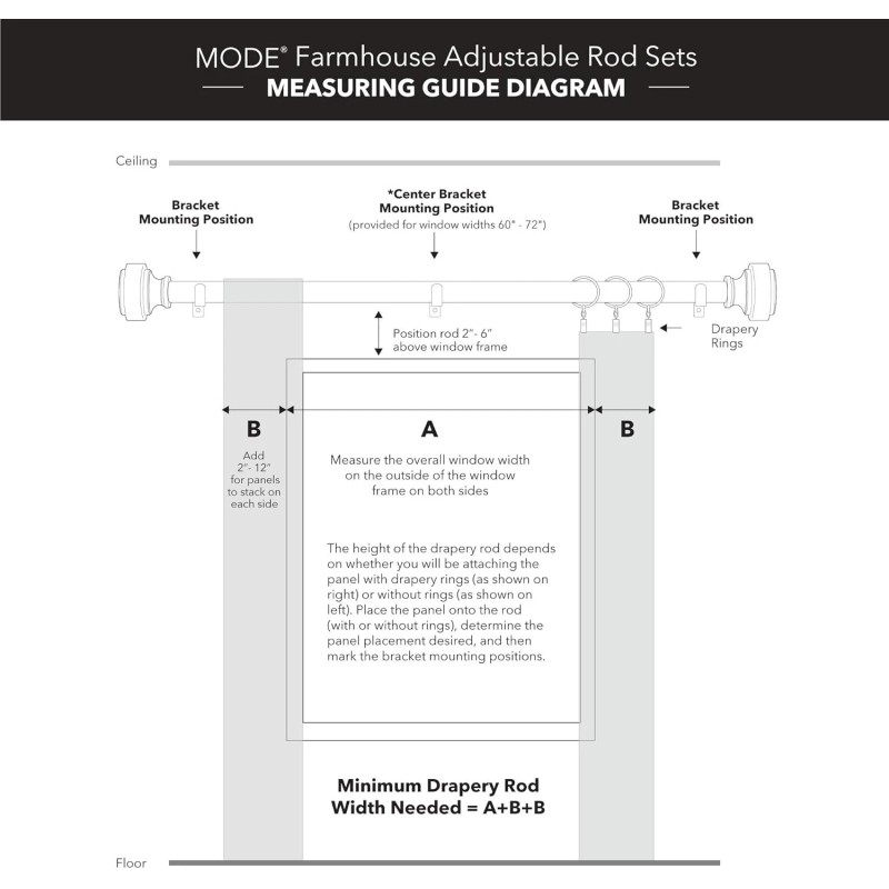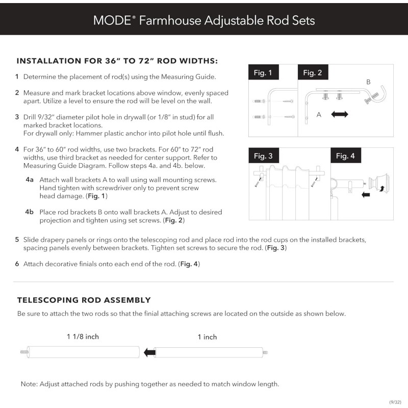 - What’s Included - The adjustable curtain rod is 1 1/8” in diameter. Also includes 2 Farmhouse Cottage Square finials, adjustable mounting brackets, screws, and drywall anchors. The 36” to 72” rod set has 2 adjustable mounting brackets, the 72” to 144” rod set has 3 brackets, and the 144” to 240” rod set has 4 brackets. The package contains detailed instructions and a list of parts. MODE Farmhouse Curtain Clip Rings are also available in coordinating finishes.