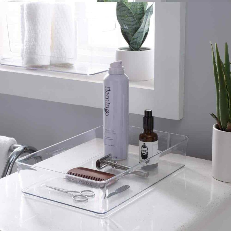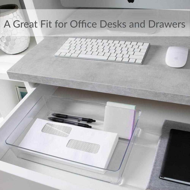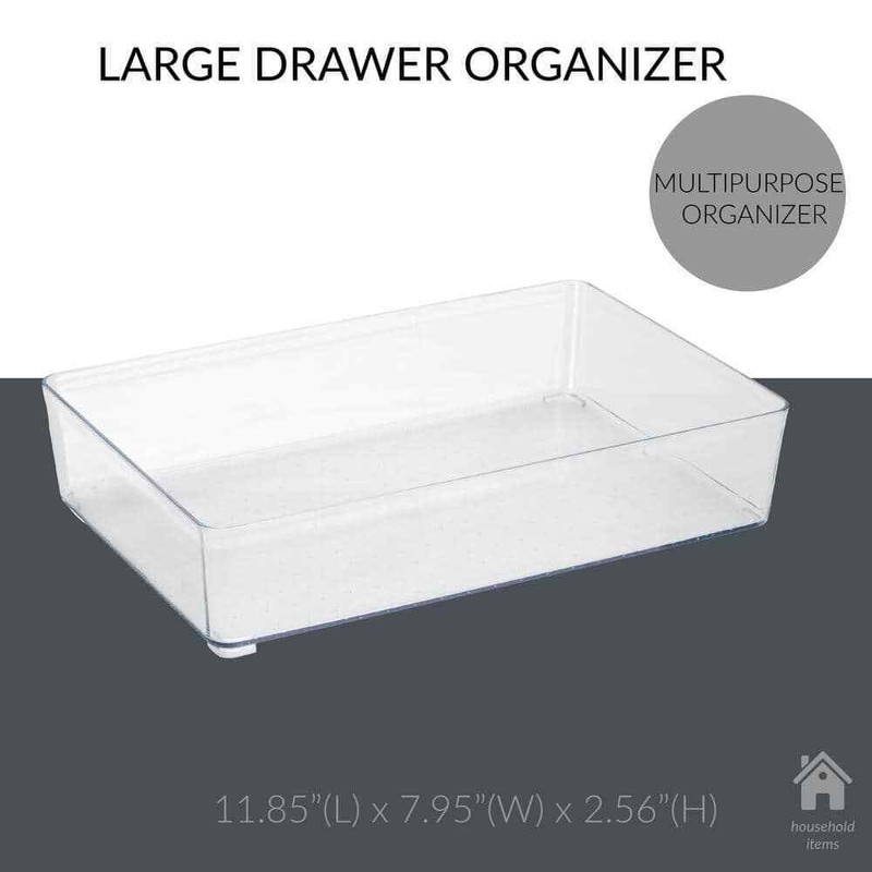 Organize your bathroom vanity or desk drawer with this Simplify Large Drawer Organizer. It is the perfect size for desk accessories such as pens, pencils, and note paper. It is also good for holding jewelry and cosmetics and brushes. The clear design makes items inside visible and easy to find. You can keep this transparent organizer bin on your desktop or countertop surface because it fits with any room's decor. Organize the little things in life with the Simplify Drawer Organizer.