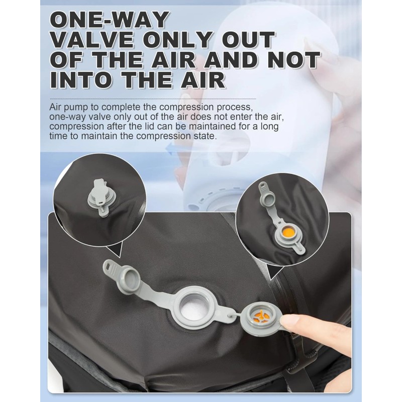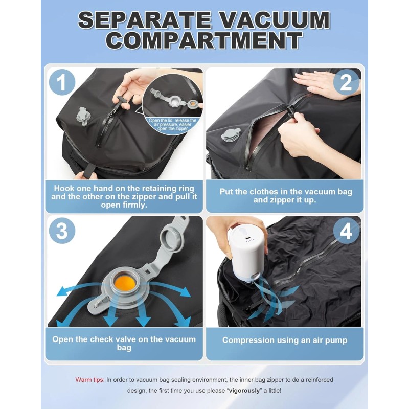 • 【Vacuum Compression Bag and Air Pump】 There is a vacuum compression bag inside the largest compartment of the backpack, you can put the clothes into the vacuum bag, tighten the zipper, open the one-way exhaust valve, and use the air pump for vacuum compression to reduce the volume of the items occupying the volume, and load more things. Please note that the zipper used in the vacuum bag requires more force to pull, this is to ensure that the vacuum airtight, not the zipper damage is not smooth.