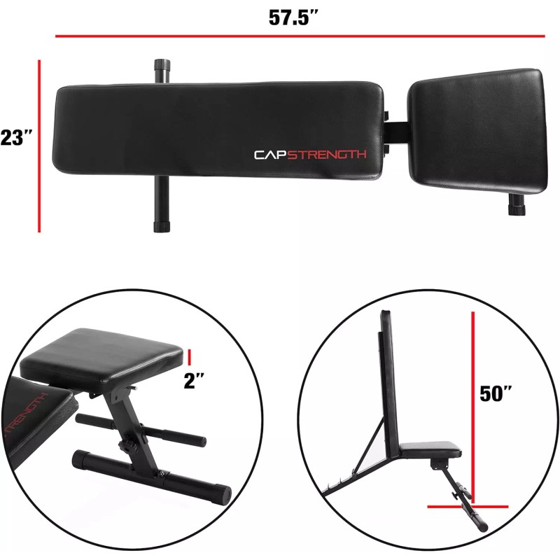 • SPECS - Maximum assembled bench dimensions are 57.5 L x 23 W x 50 H inches (at full incline), 57.5 L x 23 W x 19 H (in flat position).